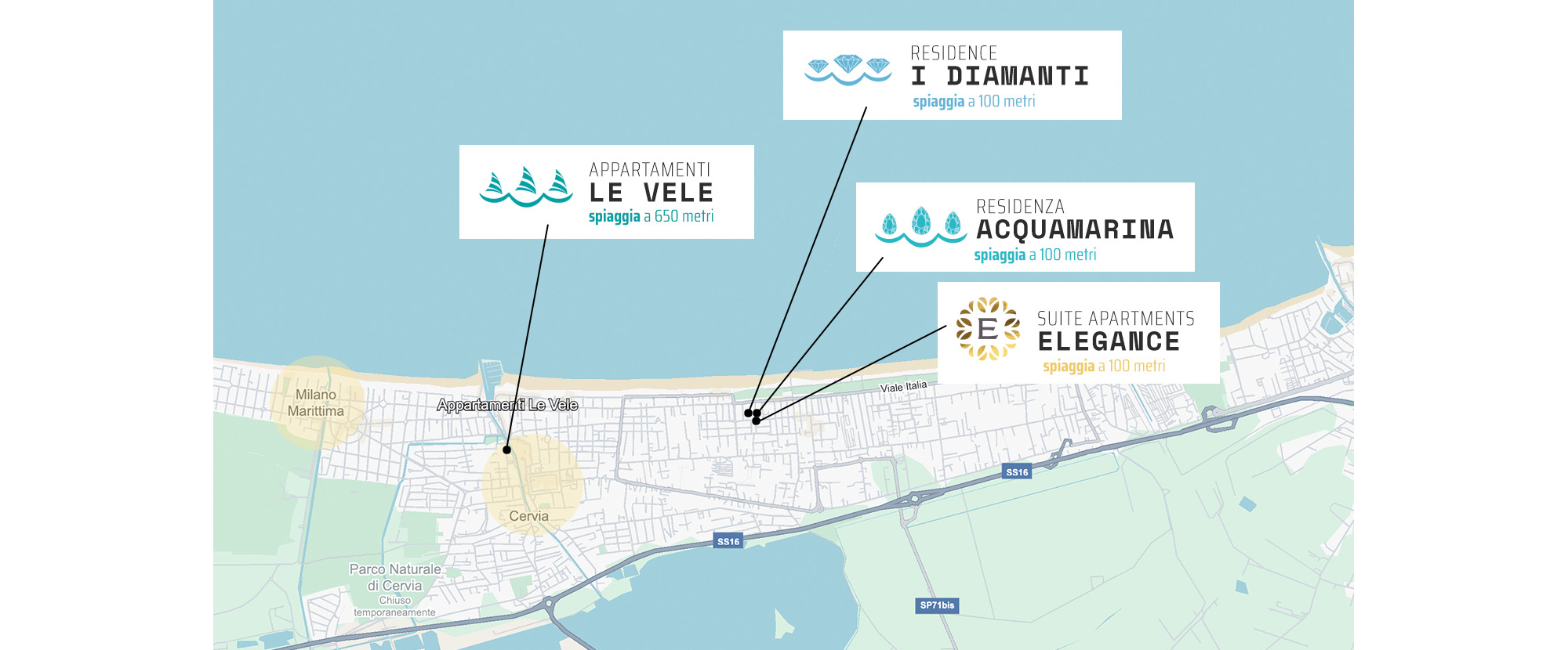 Scopri la comodità dei nostri Residence, come I Diamanti con giardini e ampi terrazzi, oppure, oppure Acquamarina, con appartamenti di grandi dimensioni fino a 3 camere da letto, e vicini alla spiaggia, l’ideale per le famiglie. Se preferisci il centro, gli Appartamenti Le Vele ti offrono una vista privilegiata sul porto canale di Cervia, per un'esperienza ancora più autentica. E infine, Elegance, con bilocali e trilocali di prestigio e uno splendido terrazzo con vasca idromassaggio!