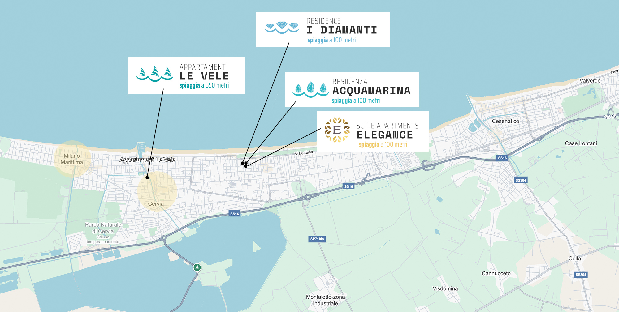 Ti proponiamo tre soluzioni di soggiorno in formula residence: se ami soggiornare a due passi dal mare e vicino alla pineta, puoi scegliere tra I Diamanti, moderni monolocali ed Elegance Suite Apartments, appartamenti e suite di pregio o Residenza Acquamarina per appartamenti indipendenti fino a 3 camere da letto.